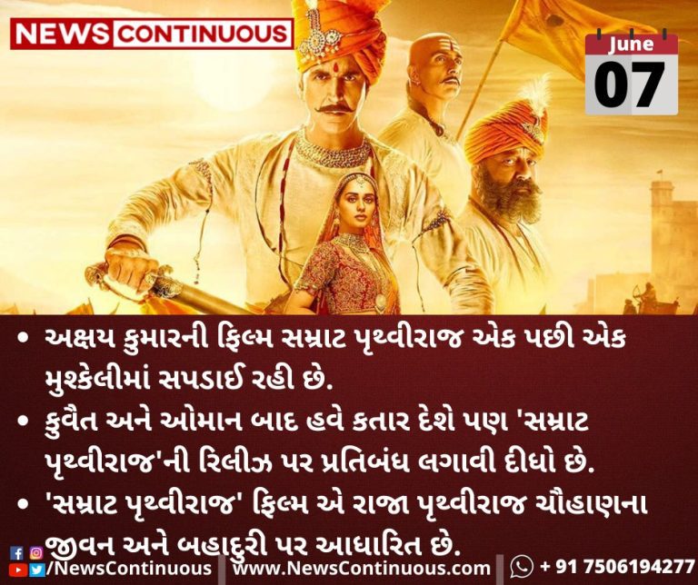 કુવૈત(Kuwait) અને ઓમાન(Oman) બાદ હવે કતાર(Qatar) દેશે પણ 'સમ્રાટ પૃથ્વીરાજ'ની રિલીઝ પર પ્રતિબંધ(Ban) લગાવી દીધો છે.
