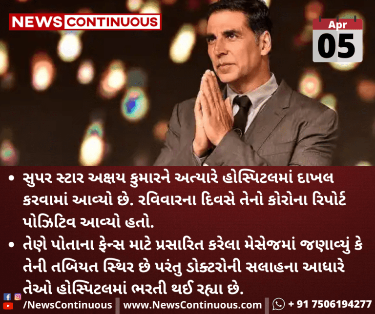 સુપર સ્ટાર અક્ષય કુમારને અત્યારે હોસ્પિટલમાં દાખલ કરવામાં આવ્યો છે. રવિવારના દિવસે તેનો કોરોના રિપોર્ટ પોઝિટિવ આવ્યો હતો.