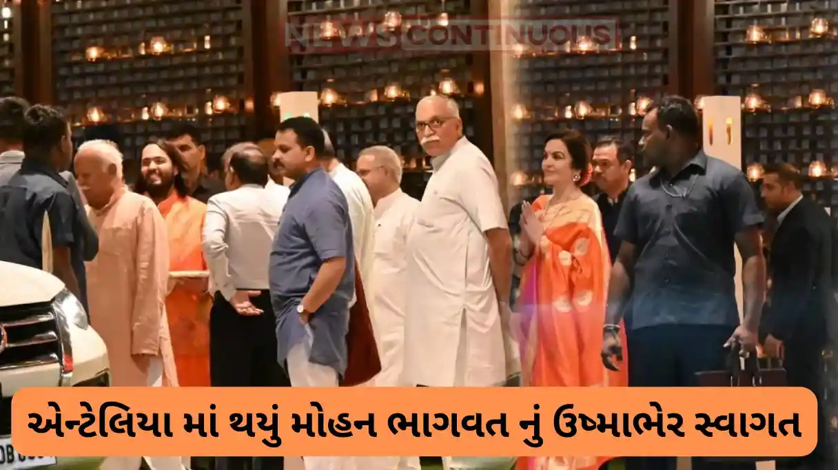 અનંત અને રાધિકા ના લગ્ન ની તૈયારીઓ ની વચ્ચે ગઈકાલે આરએસએસના સરસંઘચાલક મોહન ભાગવત અંબાણી પરિવારને મળવા એન્ટિલિયા પહોંચ્યા હતા જ્યાં તેમનું ભવ્ય સ્વાગત કરવામાં આવ્યું હતું. સમગ્ર અંબાણી પરિવાર મોહન ભાગવતના સરભરા માં વ્યસ્ત જોવા મળ્યો હતો. આ ખાસ પ્રસંગની ઘણી તસવીરો અને વીડિયો પણ સામે આવ્યા છે, જેમાં જોઈ શકાય છે કે મોહન ભાગવત અને તેમના સંઘના ઘણા સાથીદારો સાથે અંબાણી પરિવાર ને મળવા આવ્યા હતા.