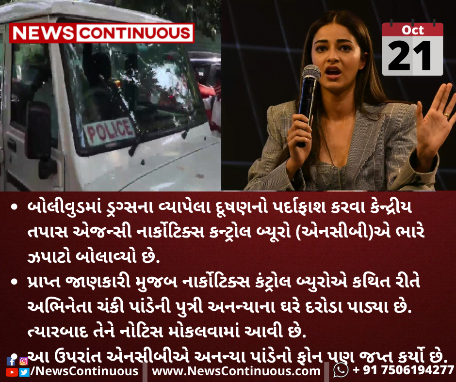 પ્રાપ્ત જાણકારી મુજબ નાર્કોટિક્સ કંટ્રોલ બ્યુરોએ કથિત રીતે અભિનેતા ચંકી પાંડેની પુત્રી અનન્યાના ઘરે દરોડા પાડ્યા છે. ત્યારબાદ તેને નોટિસ મોકલવામાં આવી છે.