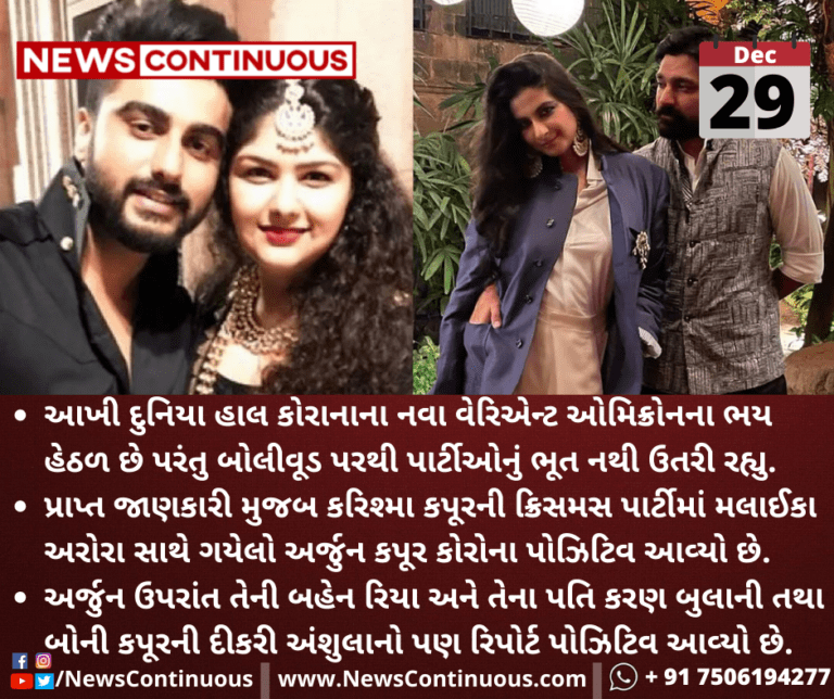પ્રાપ્ત જાણકારી મુજબ કરિશ્મા કપૂરની ક્રિસમસ પાર્ટીમાં મલાઈકા અરોરા સાથે ગયેલો અર્જુન કપૂર કોરોના પોઝિટિવ આવ્યો છે.