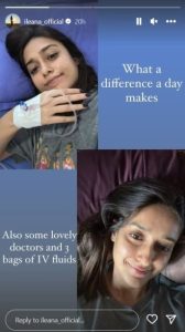 ઈલિયાના એ ઈન્સ્ટાગ્રામ પર ફોટો સાથે કેપ્શનમાં લખ્યું, ‘મારા સ્વાસ્થ્ય વિશે માહિતી માટે સતત મેસેજ કરનારા તમામ નો આભાર. હું હવે ઠીક છું અને મને સમયસર સારવાર મળી છે. તેણે એમ પણ લખ્યું છે- ‘એક દિવસમાં કેટલું બદલાય છે. કેટલાક સારા ડોકટરો અને IV પ્રવાહીની 3 બેગ’.મીડિયા રિપોર્ટ અનુસાર ઇલિયાના ને ડિહાઇડ્રેશન ને કારણે હોસ્પિટલ માં એડમિટ કરવામાં આવી હતી.