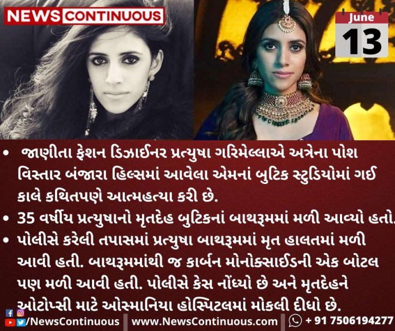 જાણીતા ફેશન ડિઝાઈનર(Fashion designer) પ્રત્યુષા ગરિમેલ્લાએ(Prathyusha Garimella) અત્રેના પોશ વિસ્તાર બંજારા હિલ્સમાં(Banjara Hills) આવેલા એમનાં બુટિક સ્ટુડિયોમાં(boutique studio) ગઈ કાલે કથિતપણે આત્મહત્યા(Suicide) કરી છે.