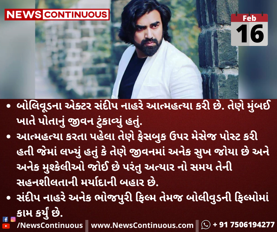 બોલિવૂડના એક્ટર સંદીપ નાહરે આત્મહત્યા કરી છે. તેણે મુંબઈ ખાતે પોતાનું જીવન ટુંકાવ્યું હતું