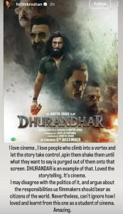 ઋત્વિક રોશને પણ પોતાના ઇન્સ્ટાગ્રામ સ્ટોરી સેક્શનમાં ‘ધુરંધર’ ફિલ્મ વિશે પોસ્ટ કરી.તેણે આ ફિલ્મને ‘અમેઝિંગ’ ગણાવી.ઋત્વિક રોશન આ ફિલ્મની સ્ટોરીટેલિંગથી પ્રભાવિત થયા હતા અને તેમનું કહેવું છે કે સિનેમાના એક વિદ્યાર્થી તરીકે તેમણે આ ફિલ્મમાંથી ઘણું ખરું શીખ્યું છે.