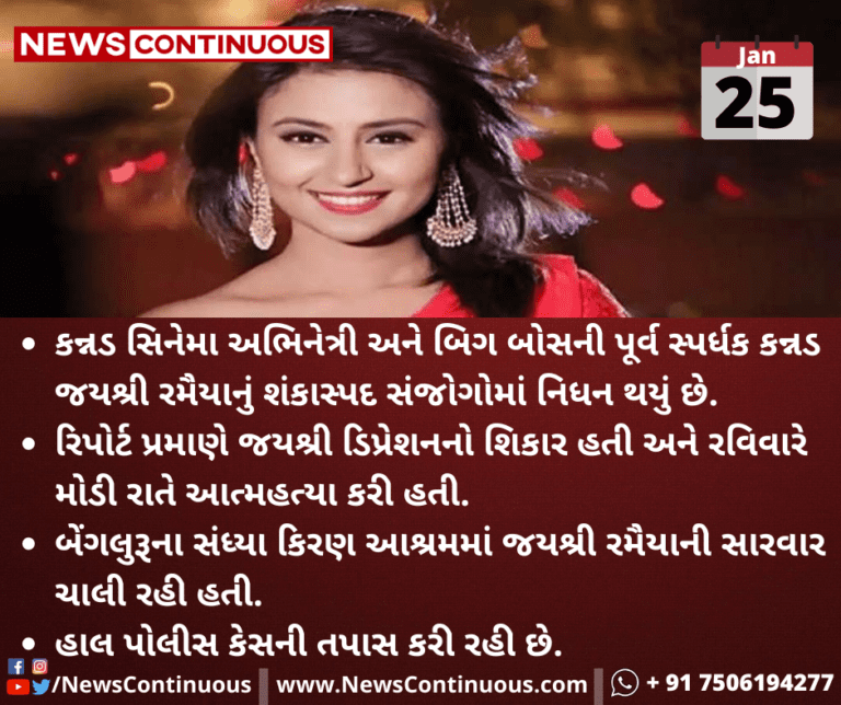 કન્નડ સિનેમા અભિનેત્રી અને બિગ બોસની પૂર્વ સ્પર્ધક કન્નડ જયશ્રી રમૈયાનું શંકાસ્પદ સંજોગોમાં નિધન થયું છે.