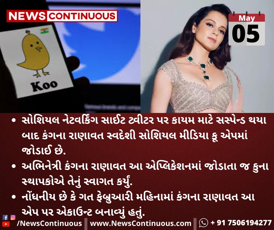 સોશિયલ નેટવર્કિંગ સાઈટ ટ્વીટર પર કાયમ માટે સસ્પેન્ડ થયા બાદ કંગના રાણાવત સ્વદેશી સોશિયલ મીડિયા કૂ એપમાં જોડાઈ છે.