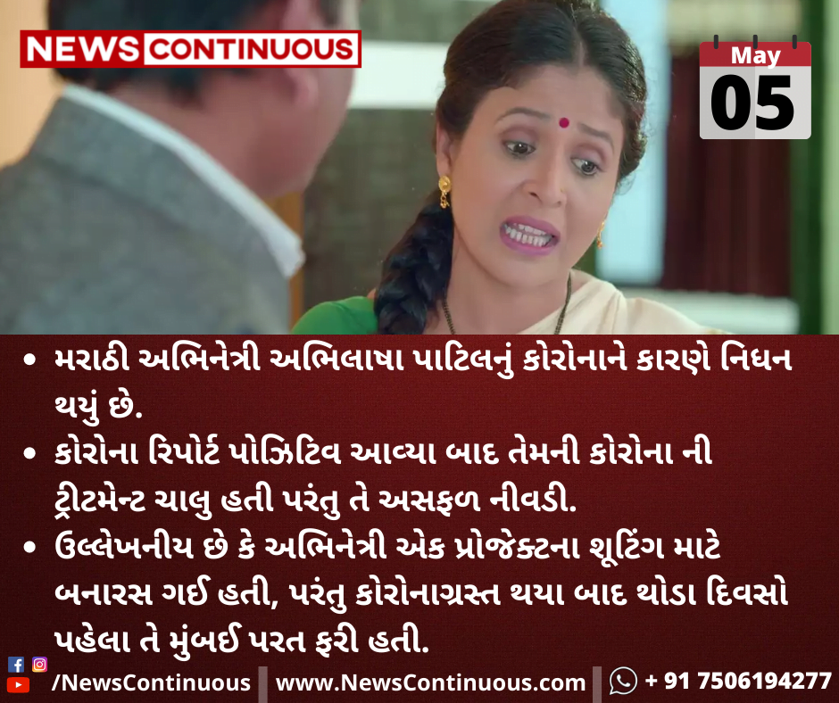 મરાઠી અભિનેત્રી અભિલાષા પાટિલનું કોરોનાને કારણે નિધન થયું છે.