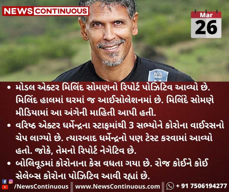 મોડલ એક્ટર મિલિંદ સોમણનો રિપોર્ટ પોઝિટિવ આવ્યો છે. મિલિંદ હાલમાં ઘરમાં જ આઈસોલેશનમાં છે. મિલિંદે સોમણે મીડિયામાં આ અંગેની માહિતી આપી હતી.