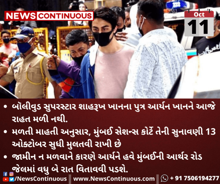 NCBએ આર્યન ડ્રગ્સ કેસને (Drugs Case) લઈને કોર્ટ પાસે સમય માંગ્યો હતો. જેને કારણે મુંબઈ સેશન્સ કોર્ટે આર્યન ખાનની જામીન અરજી પર બુધવારે સુનાવણી કરવાનો આદેશ આપ્યો છે.