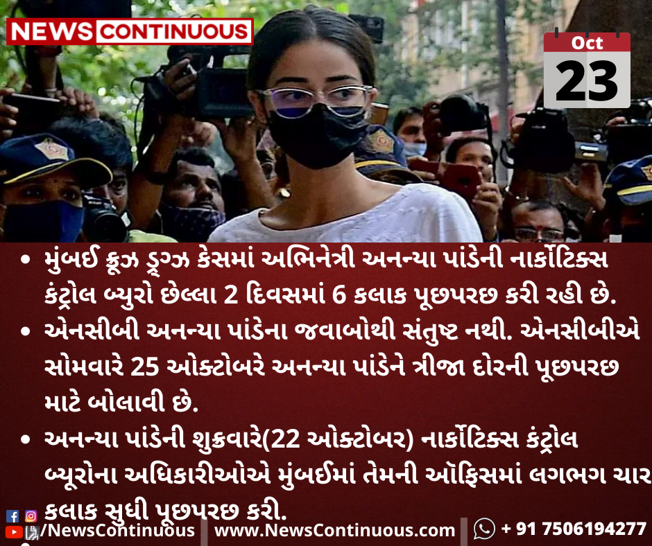 મુંબઈ ક્રુઝ ડ્રગ્સ કેસમાં અભિનેત્રી અનન્યા પાંડેની નાર્કોટિક્સ કંટ્રોલ બ્યુરો છેલ્લા 2 દિવસમાં 6 કલાક પૂછપરછ કરી રહી છે.