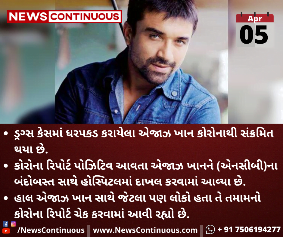 કોરોના રિપોર્ટ પોઝિટિવ આવતા એજાઝ ખાનને (એનસીબી)ના બંદોબસ્ત સાથે હોસ્પિટલમાં દાખલ કરવામાં આવ્યા છે.