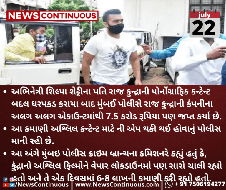 અભિનેત્રી શિલ્પા શેટ્ટીના પતિ રાજ કુન્દ્રાની પોર્નોગ્રાફિક કન્ટેન્ટ બદલ ધરપકડ કરાયા બાદ મુંબઈ પોલીસે રાજ કુન્દ્રાની કંપનીના અલગ અલગ એકાઉન્ટમાંથી 7.5 કરોડ રૂપિયા પણ જપ્ત કર્યા છે.