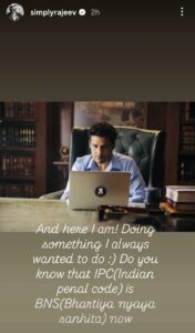 રાજીવે પોતાની ઇન્સ્ટાગ્રામ સ્ટોરી પર એક તસવીર શેર કરતા લખ્યું છે, “અને હવે એક નવી શરૂઆત! કંઈક એવું કરી રહ્યો છું જે હું હંમેશાથી કરવા માંગતો હતો.” આ પોસ્ટમાં તેણે કાયદાકીય ફેરફારનો ઉલ્લેખ કરતા પૂછ્યું કે, “શું તમને ખબર છે કે IPC (ઈન્ડિયન પીનલ કોડ) હવે BNS (ભારતીય ન્યાય સંહિતા) થઈ ગયો છે?” જોકે, રાજીવે એ સ્પષ્ટ કર્યું નથી કે તે એક્ટિંગ સંપૂર્ણપણે છોડી રહ્યો છે કે વકાલાતની સાથે ચાલુ રાખશે.