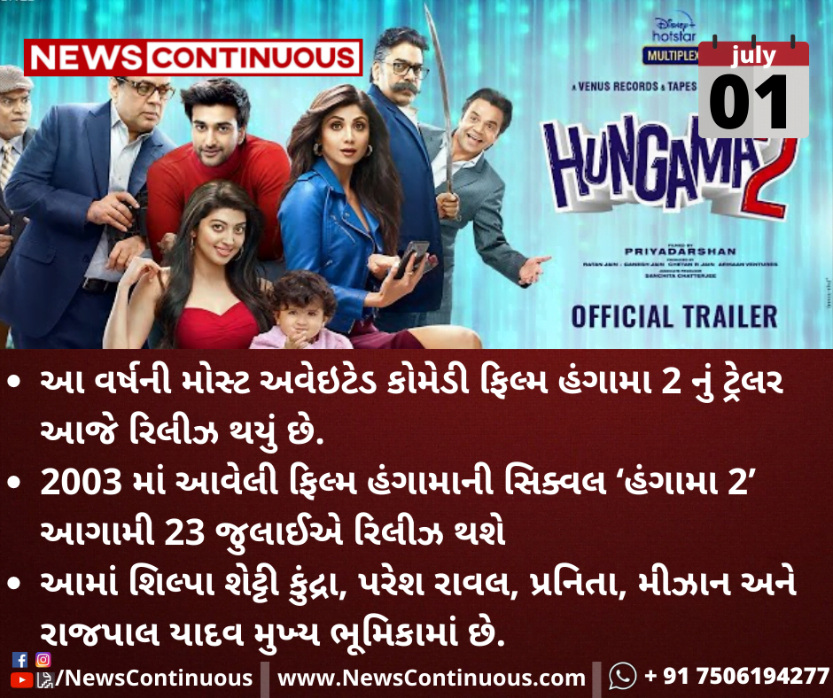 આ વર્ષની મોસ્ટ અવેઇટેડ કોમેડી ફિલ્મ હંગામા 2 નું ટ્રેલર આજે રિલીઝ થયું છે.