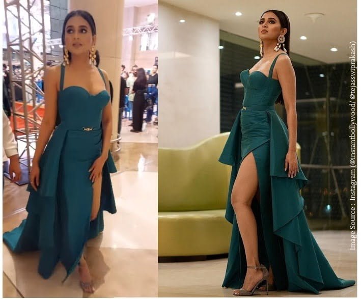 દુબઈ ઈવેન્ટના વાયરલ થયેલા વીડિયોમાં તેજસ્વી પ્રકાશ ગ્રીન કલર (green dress) નો ખૂબ જ સિઝલિંગ ડ્રેસ પહેરેલો જોવા મળી રહી છે. તેનો ડ્રેસ થાઈ હાઈ સ્લિટ (thigh high slit) છે. તેના ડ્રેસ માં મોટો કટ છે. વિડીયોમાં જોઈ શકાય છે કે તેજસ્વી પ્રકાશ ઇવેન્ટમાં પ્રવેશતાની સાથે જ તેને ખ્યાલ આવે છે કે અહીં ઘણા બધા કેમેરા (camera) છે, તેથી તે તેના હાથથી તેના ઉંચા સ્લિટ કટને ઢાંકતી જોવા મળે છે. તમને જણાવી દઈએ કે, ઈવેન્ટમાં તેજસ્વીએ સ્મોકી આઈ મેકઅપ સાથે ન્યૂડ કલર લિપસ્ટિક લગાવીને પોતાનો લુક કમ્પ્લીટ કર્યો છે. આ સાથે તેણે પાછળના ભાગે મિડલ પાર્ટિશન આપીને વાળ ખુલ્લા છોડી દીધા છે.