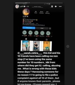 છેલ્લા કેટલાક દિવસોથી કેટલાક ટીનેજ બાળકો ફોન પર ઉર્ફી સાથે દુર્વ્યવહાર કરી રહ્યા હતા. આ વાતનો ખુલાસો ખુદ ઉર્ફી જાવેદે કર્યો છે. તાજેતરમાં જ ટીવી એક્ટ્રેસે તેના ઈન્સ્ટાગ્રામ એકાઉન્ટ પર એક સ્ટોરી શેર કરી છે. આ સ્ટોરીમાં ઉર્ફીએ એક છોકરાને ટેગ કરીને કહ્યું, ‘આ બાળક અને તેના 10 મિત્રો મને સતત ફોન કરી રહ્યા છે. હું લાંબા સમયથી એક જ નંબરનો ઉપયોગ કરી રહી છું અને મને ખબર નથી કે તેમને તે નંબર ક્યાંથી મળ્યો. આ લોકો મારી સાથે દુર્વ્યવહાર કરી રહ્યા છે. આ દિવસોમાં બાળકોને શું થયું છે? તેઓ મને કોઈ કારણ વગર પરેશાન કરી રહ્યા છે.અભિનેત્રીએ આગળ લખ્યું, ‘હું આ 10 સે 10 બાળકો સામે પોલીસ ફરિયાદ નોંધાવવા જઈ રહી છું, પરંતુ જો કોઈ તેમના માતા-પિતાને ઓળખતું હોય તો મને જણાવો. આ માટે હું તેને ઈનામ પણ આપીશ!’