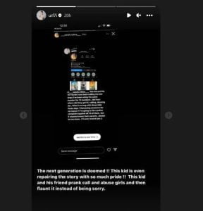 વાત અહીં પુરી નથી થઈ, ટીવી એક્ટ્રેસનો ગુસ્સો ત્યારે વધુ ભડકી ગયો જ્યારે આ છોકરાએ ઉર્ફીની આ સ્ટોરી પોતાના ઈન્સ્ટાગ્રામ એકાઉન્ટ પર શેર કરી. અભિનેત્રીએ લખ્યું, ‘આગામી પેઢી સંપૂર્ણપણે બરબાદ થઈ ગઈ છે. આટલું બધું હોવા છતાં, આ બાળક મારી વાર્તા ખૂબ ગર્વ સાથે શેર કરી રહ્યો છે. તેણે માફી માંગવી જોઈએ, પરંતુ તેના બદલે તે તેનું પ્રદર્શન કરી રહ્યો છે! આવા છોકરાઓ છોકરીઓને કોલ કરે છે અને પ્રેન્ક ના નામે તેમની સાથે દુર્વ્યવહાર કરે છે, પછી તેને બેશરમ બની ને તેનું પ્રદર્શન પણ કરે છે.