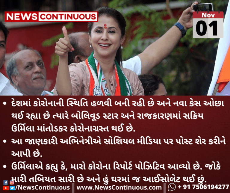 ઉર્મિલાએ કહ્યુ કે, મારો કોરોના રિપોર્ટ પોઝિટિવ આવ્યો છે. જોકે મારી તબિયત સારી છે અને હું ઘરમાં જ આઈસોલેટ થઈ છું.