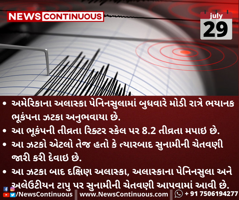 આ ઝટકા બાદ દક્ષિણ અલાસ્કા, અલાસ્કાના પેનિનસુલા અને અલેઉટીયન ટાપુ પર સુનામીની ચેતવણી આપવામાં આવી છે.