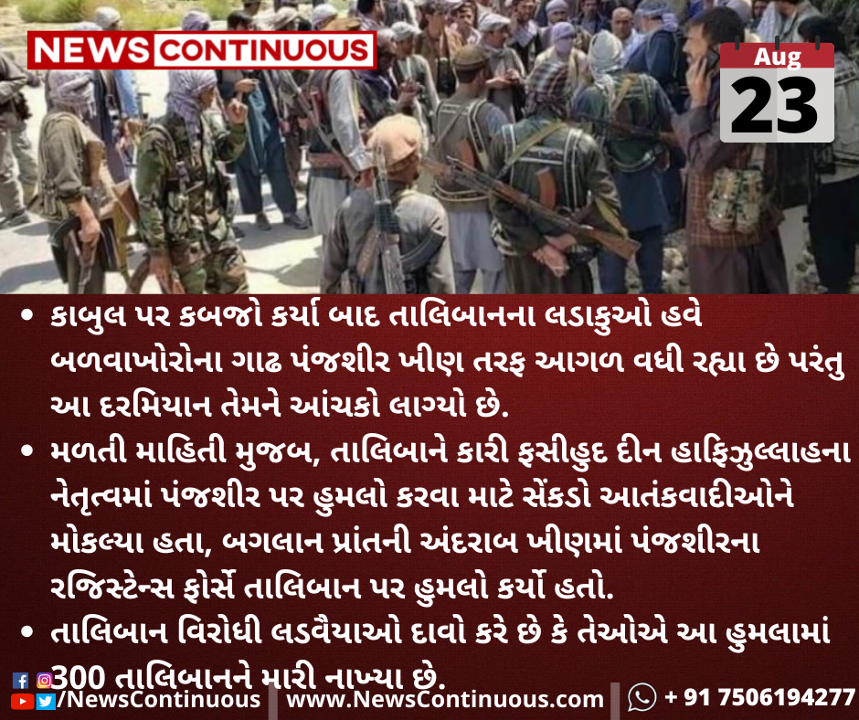 કાબુલ પર કબજો કર્યા બાદ તાલિબાનના લડાકુઓ હવે બળવાખોરોના ગાઢ પંજશીર ખીણ તરફ આગળ વધી રહ્યા છે પરંતુ આ દરમિયાન તેમને આંચકો લાગ્યો છે.