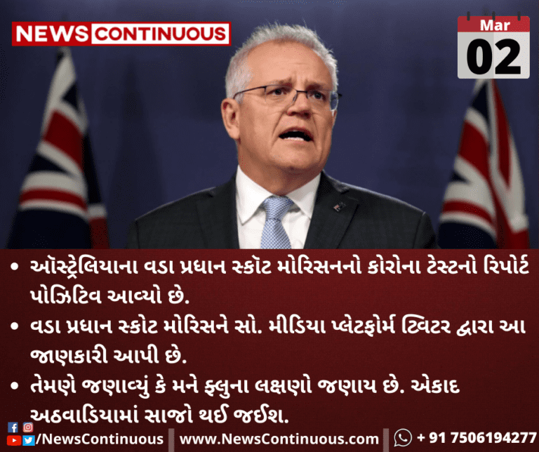 ઑસ્ટ્રેલિયાના વડા પ્રધાન સ્કૉટ મોરિસનનો કોરોના ટેસ્ટનો રિપોર્ટ પોઝિટિવ આવ્યો છે.