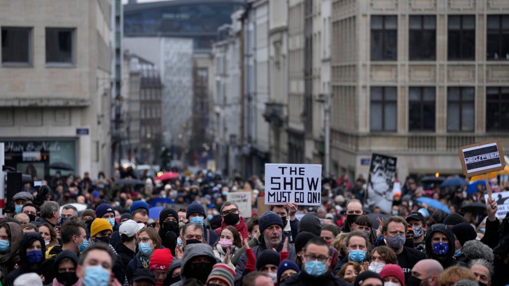 વિરોધકર્તાઓ રાજધાનીના મોન્ટ ડેસ આર્ટ્સ સ્ક્વેરમાં તેમના હાથમાં લખેલા પ્લેકાર્ડ સાથે એકઠા થયા હતા. અહીં તેઓએ સૂત્રોચ્ચાર કર્યા હતા અને સંગીતના સાધનો વગાડીને સરકારના ર્નિણયનો વિરોધ કર્યો હતો. તેમણે કહ્યું કે થિયેટર, સિનેમા હોલ જેવા સાંસ્કૃતિક સ્થળો બંધ કરીને સરકારે સારું કર્યું નથી. તેણે આ નિર્ણય તાત્કાલિક પાછો ખેંચવો જાેઈએ.