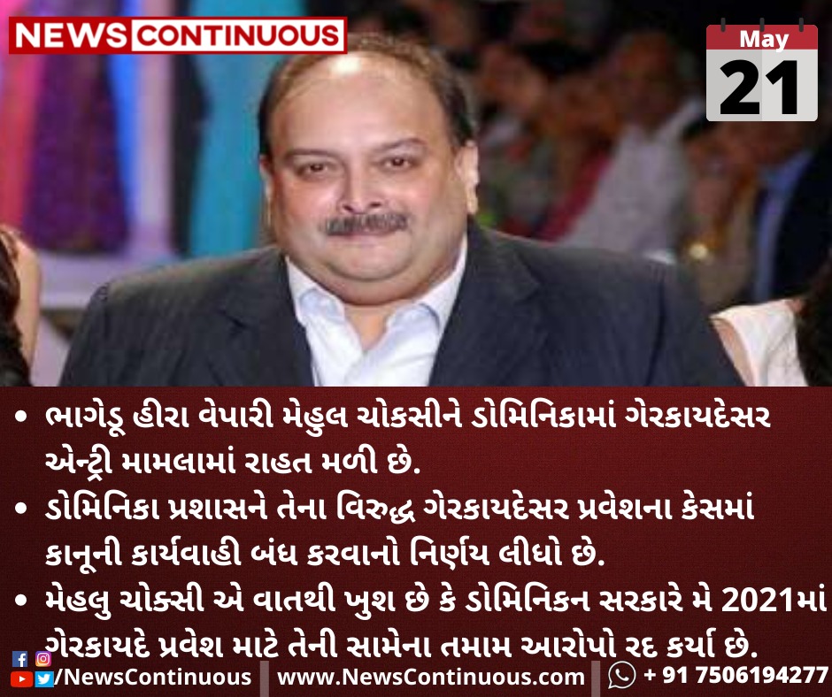 ભાગેડૂ હીરા વેપારી(Diamond trader) મેહુલ ચોકસીને(Mehul Choksi) ડોમિનિકામાં(Dominica) ગેરકાયદેસર એન્ટ્રી(Illegal entry) મામલામાં રાહત મળી છે.