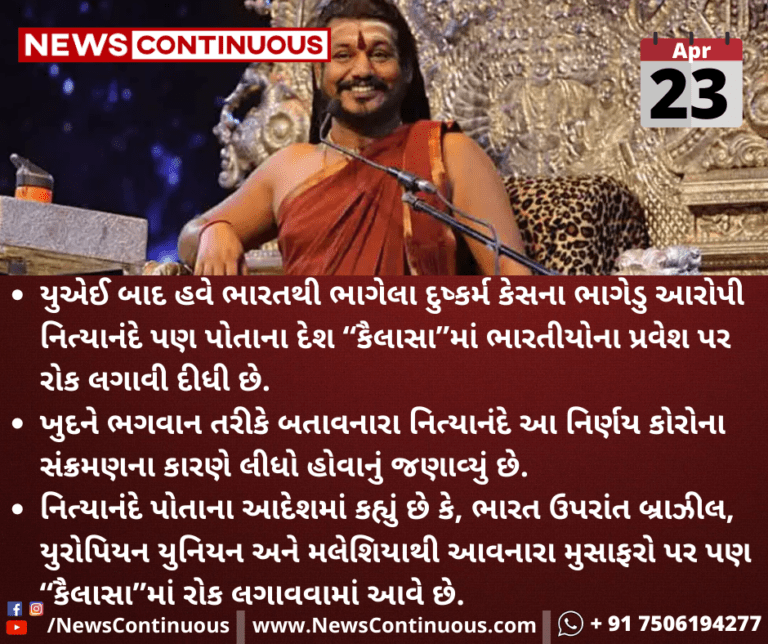 યુએઈ બાદ હવે ભારતથી ભાગેલા દુષ્કર્મ કેસના ભાગેડુ આરોપી નિત્યાનંદે પણ પોતાના દેશ “કૈલાસા”મા ભારતીયોના પ્રવેશ પર રોક લગાવી દીધી છે.