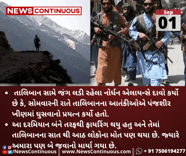 તાલિબાન સામે જંગ લડી રહેલા નોર્ધન એલાયન્સે દાવો કર્યો છે કે, સોમવારની રાતે તાલિબાનના આતંકીઓએ પંજશીર ખીણમાં ઘુસવાનો પ્રયત્ન કર્યો હતો.