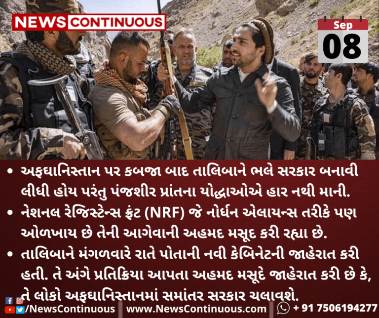 તાલિબાને મંગળવારે રાતે પોતાની નવી કેબિનેટની જાહેરાત કરી હતી. તે અંગે પ્રતિક્રિયા આપતા અહમદ મસૂદે જાહેરાત કરી છે કે, તે લોકો અફઘાનિસ્તાનમાં સમાંતર સરકાર ચલાવશે.