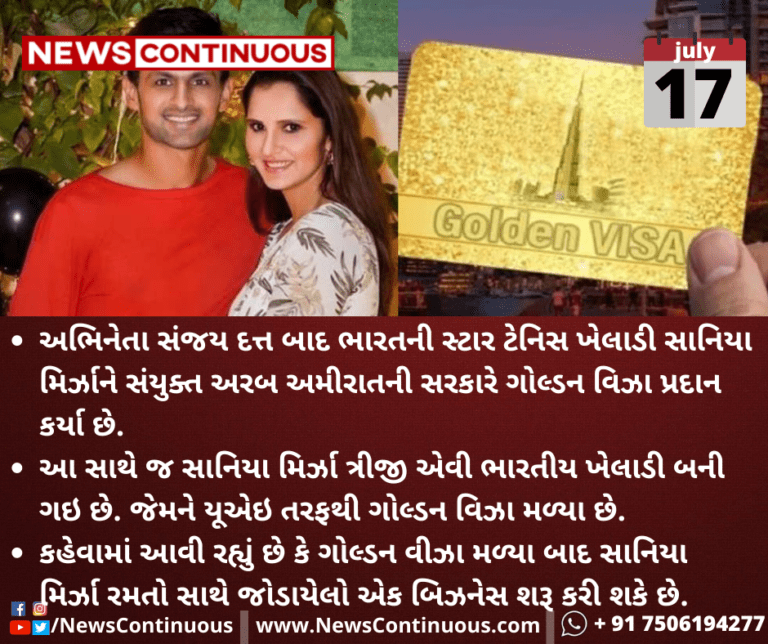 અભિનેતા સંજય દત્ત બાદ ભારતની સ્ટાર ટેનિસ ખેલાડી સાનિયા મિર્ઝાને સંયુક્ત અરબ અમીરાતની સરકારે ગોલ્ડન વિઝા પ્રદાન કર્યા છે.