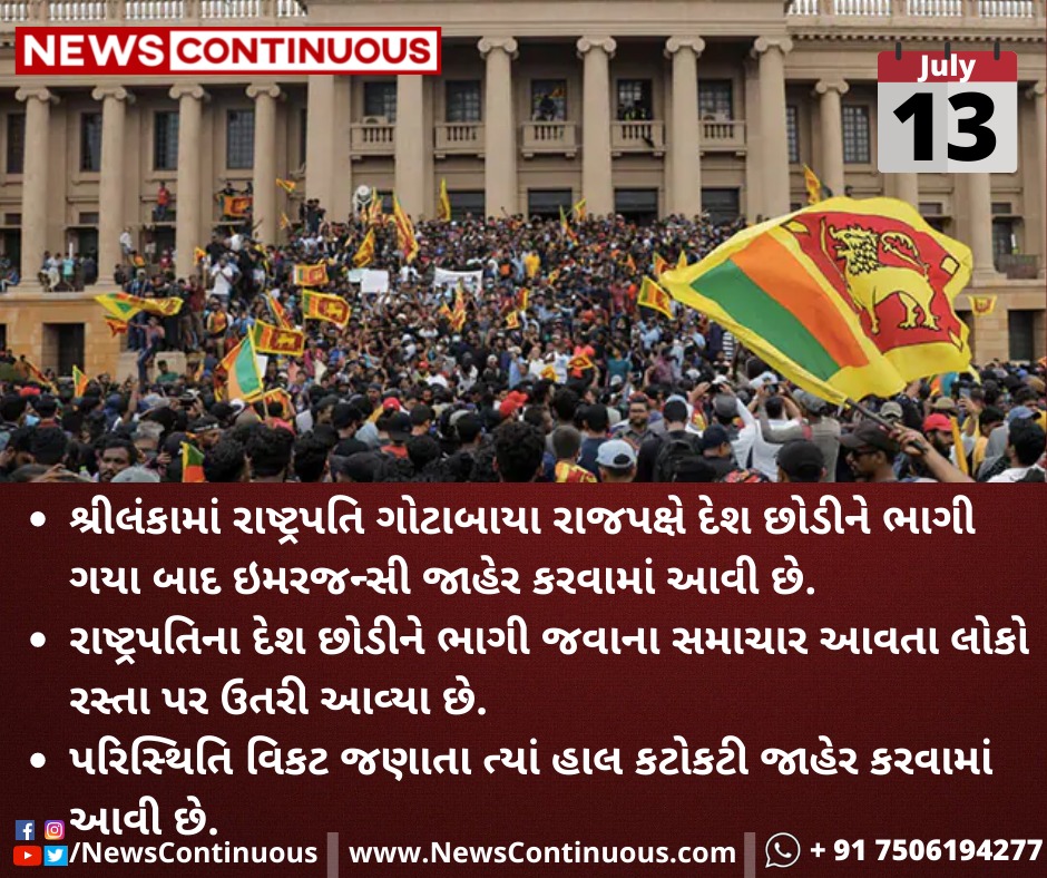 શ્રીલંકા(Sri lanka)માં રાષ્ટ્રપતિ ગોટાબાયા રાજપક્ષે(President Gotabaya Rajapaksa)દેશ છોડીને ભાગી ગયા બાદ ઇમરજન્સી (Emergency) જાહેર કરવામાં આવી છે.