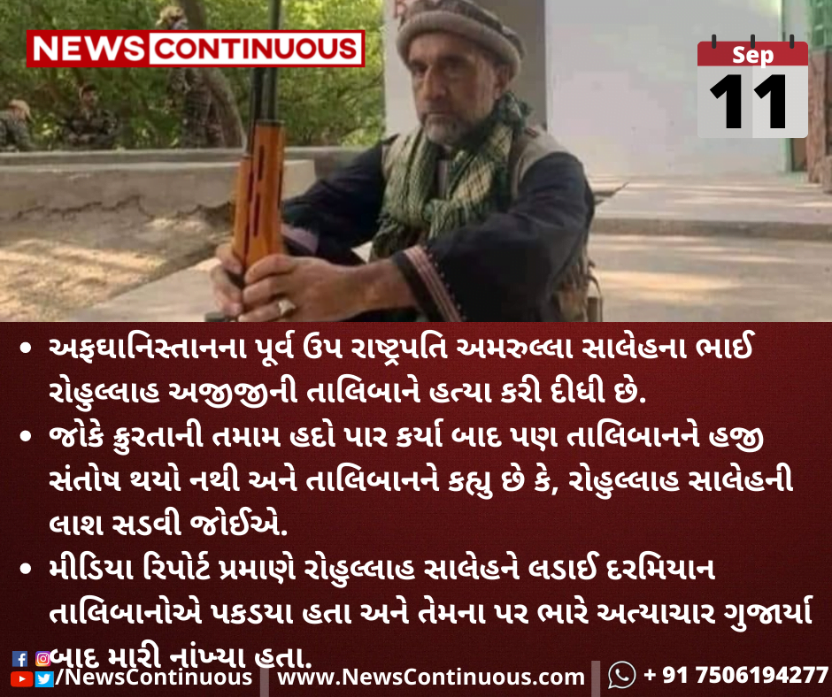 અફઘાનિસ્તાનના પૂર્વ ઉપ રાષ્ટ્રપતિ અમરુલ્લા સાલેહના ભાઈ રોહુલ્લાહ અજીજીની તાલિબાને હત્યા કરી દીધી છે.