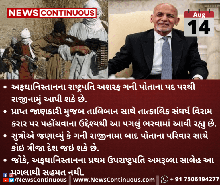 અફઘાનિસ્તાનના રાષ્ટ્રપતિ અશરફ ગની પોતાના પદ પરથી રાજીનામું આપી શકે છે.