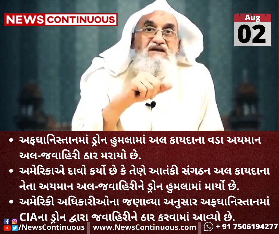અમેરિકી અધિકારીઓના જણાવ્યા અનુસાર અફઘાનિસ્તાનમાં CIAના ડ્રોન દ્વારા જવાહિરીને ઠાર કરવામાં આવ્યો છે.