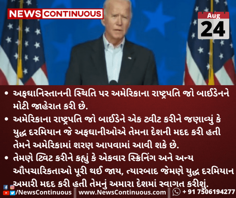 અમેરિકાના રાષ્ટ્રપતિ જો બાઈડેને એક ટ્વીટ કરીને જણાવ્યું કે યુદ્ધ દરમિયાન જે અફઘાનીઓએ તેમના દેશની મદદ કરી હતી તેમને અમેરિકામાં શરણ આપવામાં આવી શકે છે.
