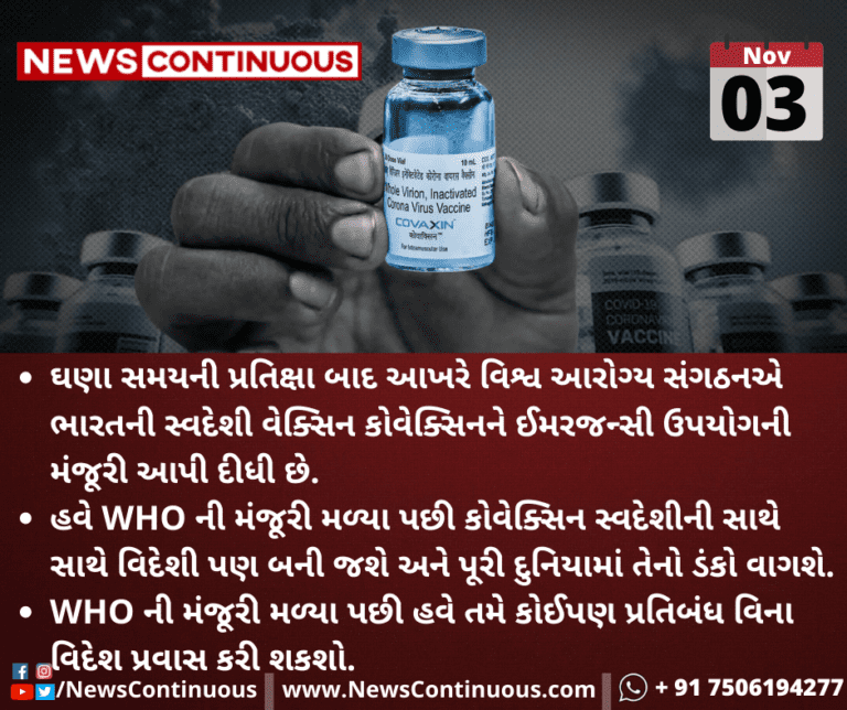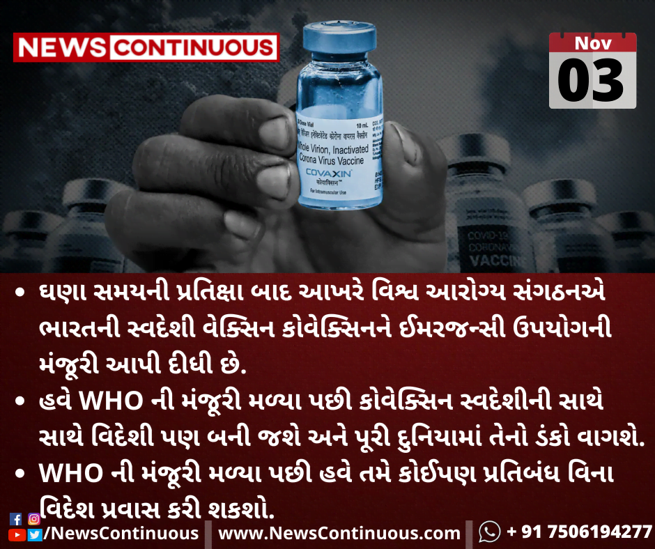 ઘણા સમયની પ્રતિક્ષા બાદ આખરે વિશ્વ આરોગ્ય સંગઠનએ ભારતની સ્વદેશી વેક્સિન કોવેક્સિનને ઈમરજન્સી ઉપયોગની મંજૂરી આપી દીધી છે.