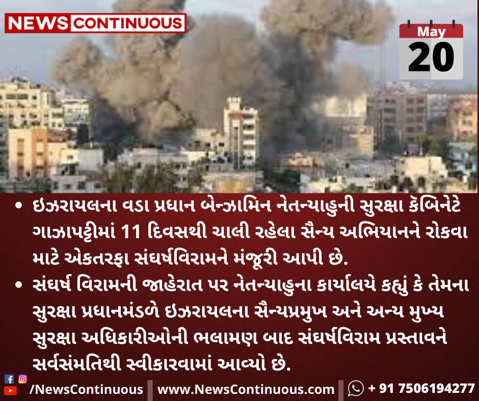 ઇઝરાયલના વડા પ્રધાન બેન્ઝામિન નેતન્યાહુની સુરક્ષા કૅબિનેટે ગાઝાપટ્ટીમાં 11 દિવસથી ચાલી રહેલા સૈન્ય અભિયાનને રોકવા માટે એકતરફા સંઘર્ષવિરામને મંજૂરી આપી છે.