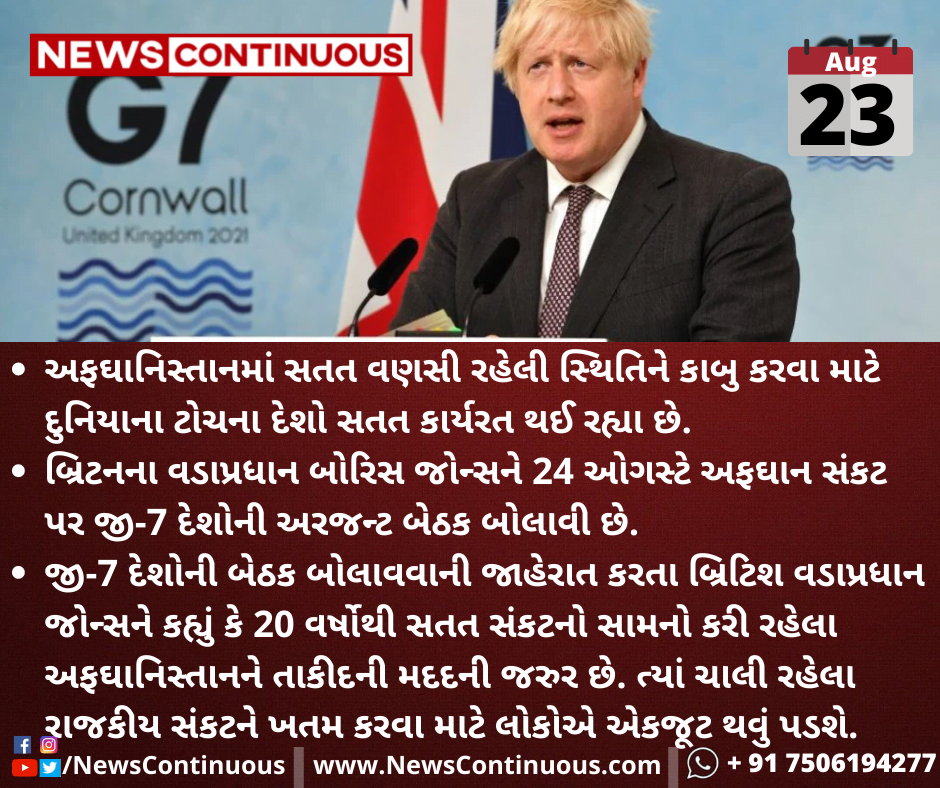 બ્રિટનના વડાપ્રધાન બોરિસ જોન્સને 24 ઓગસ્ટે અફઘાન સંકટ પર જી-7 દેશોની અરજન્ટ બેઠક બોલાવી છે.