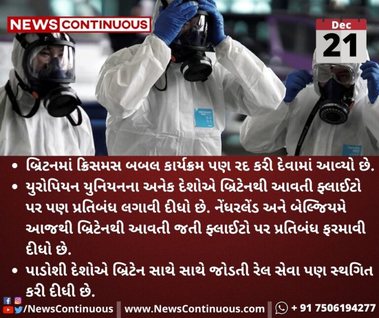 - યુરોપિયન યુનિયનના અનેક દેશોએ બ્રિટેનથી આવતી ફ્લાઈટો પર પણ પ્રતિબંધ લગાવી દીધો છે. નેંધરલેંડ અને બેલ્જિયમે આજથી બ્રિટેનથી આવતી જતી ફ્લાઈટો પર પ્રતિબંધ ફરમાવી દીધો છે.