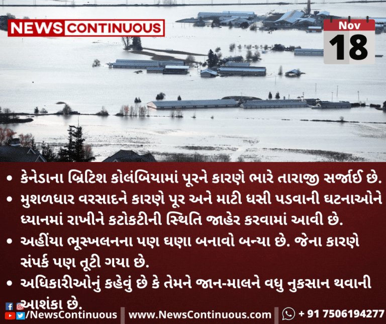 કેનેડાના બ્રિટિશ કોલંબિયામાં પૂરને કારણે ભારે તારાજી સર્જાઈ છે.