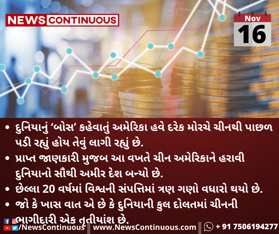 પ્રાપ્ત જાણકારી મુજબ આ વખતે ચીન અમેરિકાને હરાવી દુનિયાનો સૌથી અમીર દેશ બન્યો છે.
