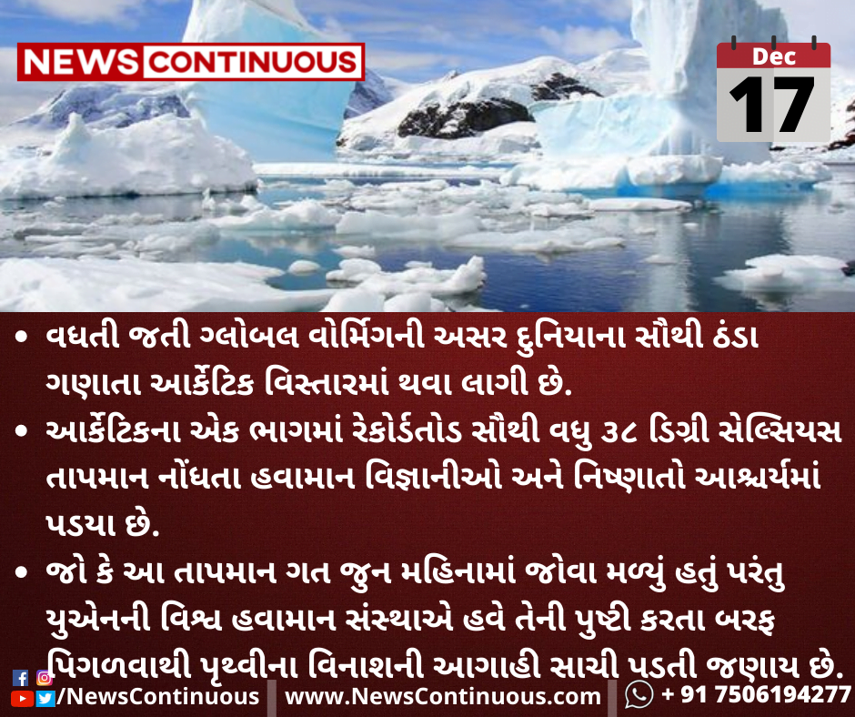 આર્કેટિકના એક ભાગમાં રેકોર્ડતોડ સૌથી વધુ ૩૮ ડિગ્રી સેલ્સિયસ તાપમાન નોંધતા હવામાન વિજ્ઞાનીઓ અને નિષ્ણાતો આશ્ચર્યમાં પડયા છે.