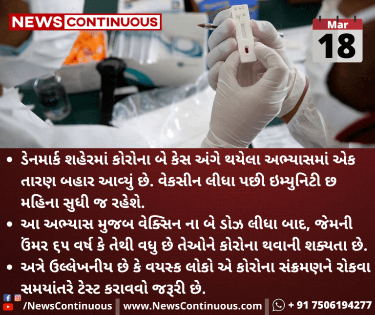 ડેનમાર્ક શહેરમાં કોરોના બે કેસ અંગે થયેલા અભ્યાસમાં એક તારણ બહાર આવ્યું છે. વેકસીન લીધા પછી ઇમ્યુનિટી છ મહિના સુધી જ રહેશે.