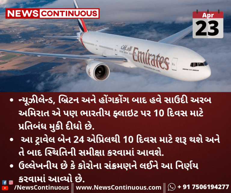 ન્યૂઝીલેન્ડ, બ્રિટન અને હોંગકોંગ બાદ હવે સાઉદી અરબ અમિરાત એ પણ ભારતીય ફ્લાઇટ પર 10 દિવસ માટે પ્રતિબંધ મુકી દીધો છે.