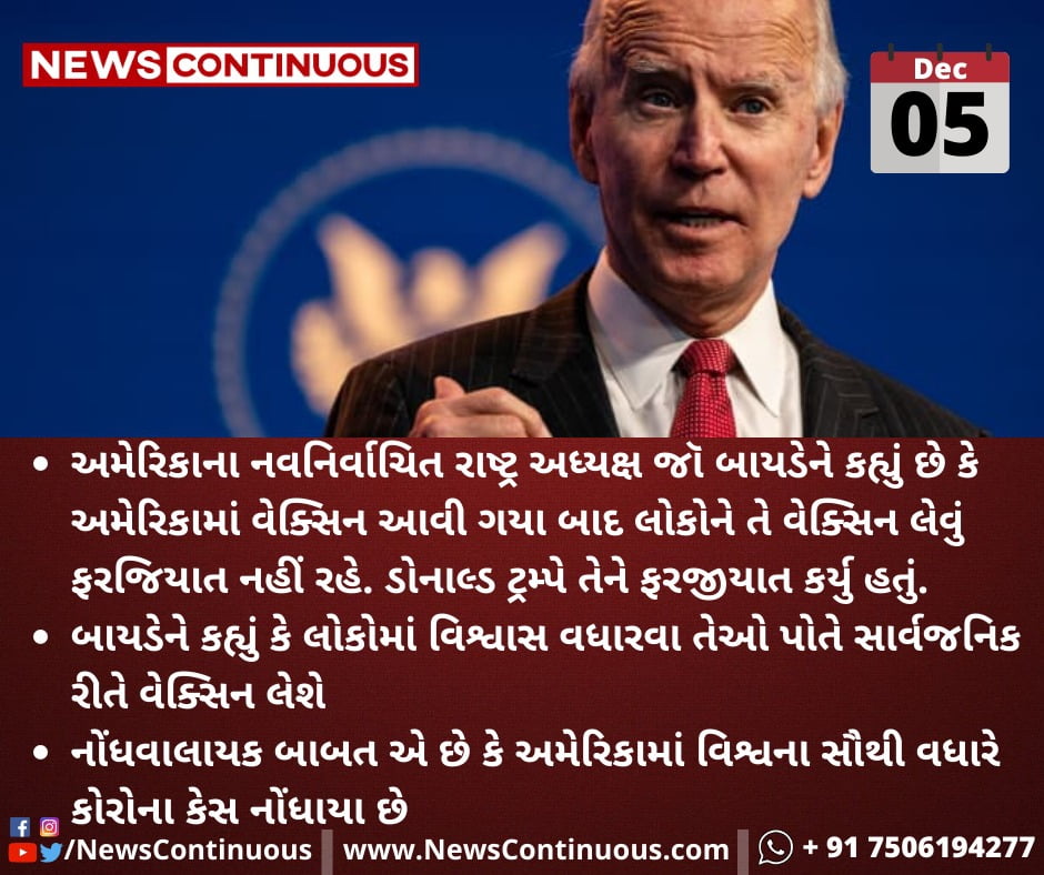 કોરોના વેક્સીનને લઈને બાયડેને આપ્યું મહત્વનું બયાન. અમેરિકાનો સાથે કોઈ જબરદસ્તી નહી. જાણો વિગત