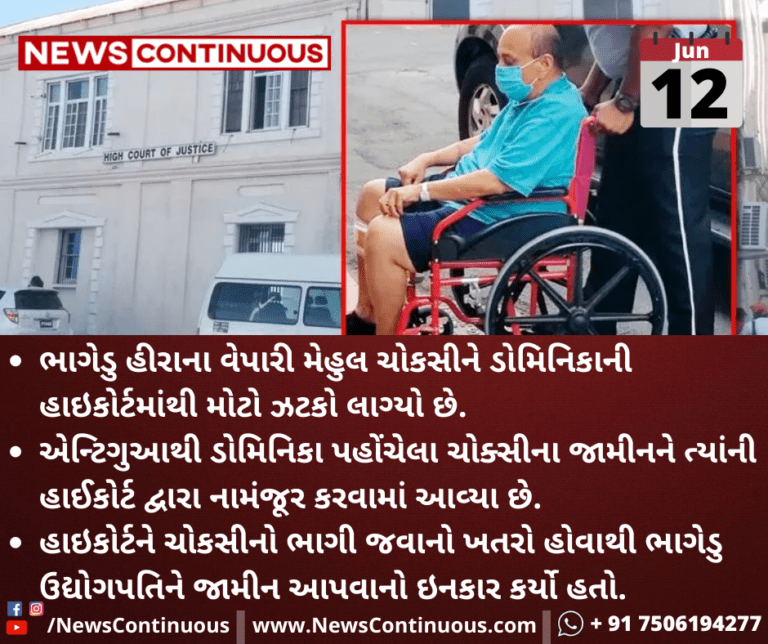 અગાઉ ડોમિનિકા હાઇકોર્ટે ચોકસીની જામીન અરજી સુનાવણી 11 જૂન સુધી ટાળી દીધી હતી.