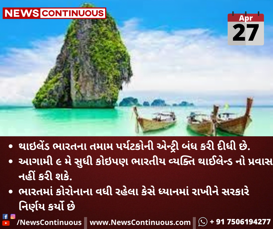 આગામી ૯ મે સુધી કોઇપણ ભારતીય વ્યક્તિ થાઈલેન્ડ નો પ્રવાસ નહીં કરી શકે.