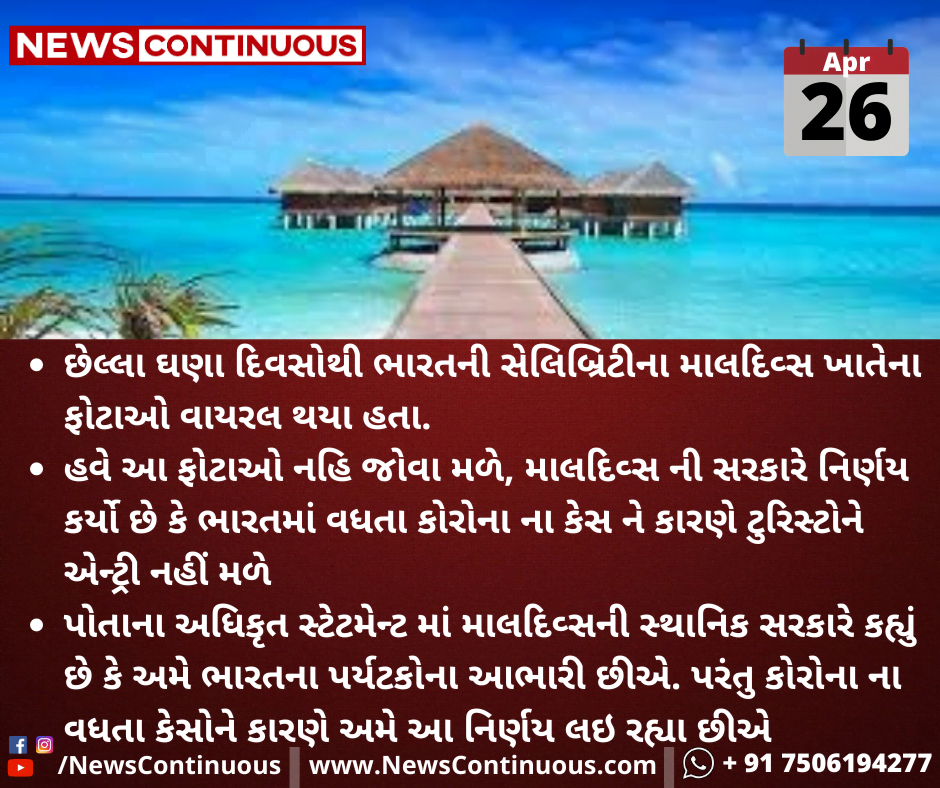 હવે આ ફોટાઓ નહિ જોવા મળે, માલદિવ્સ ની સરકારે નિર્ણય કર્યો છે કે ભારતમાં વધતા કોરોના ના કેસ ને કારણે ટુરિસ્ટોને એન્ટ્રી નહીં મળે